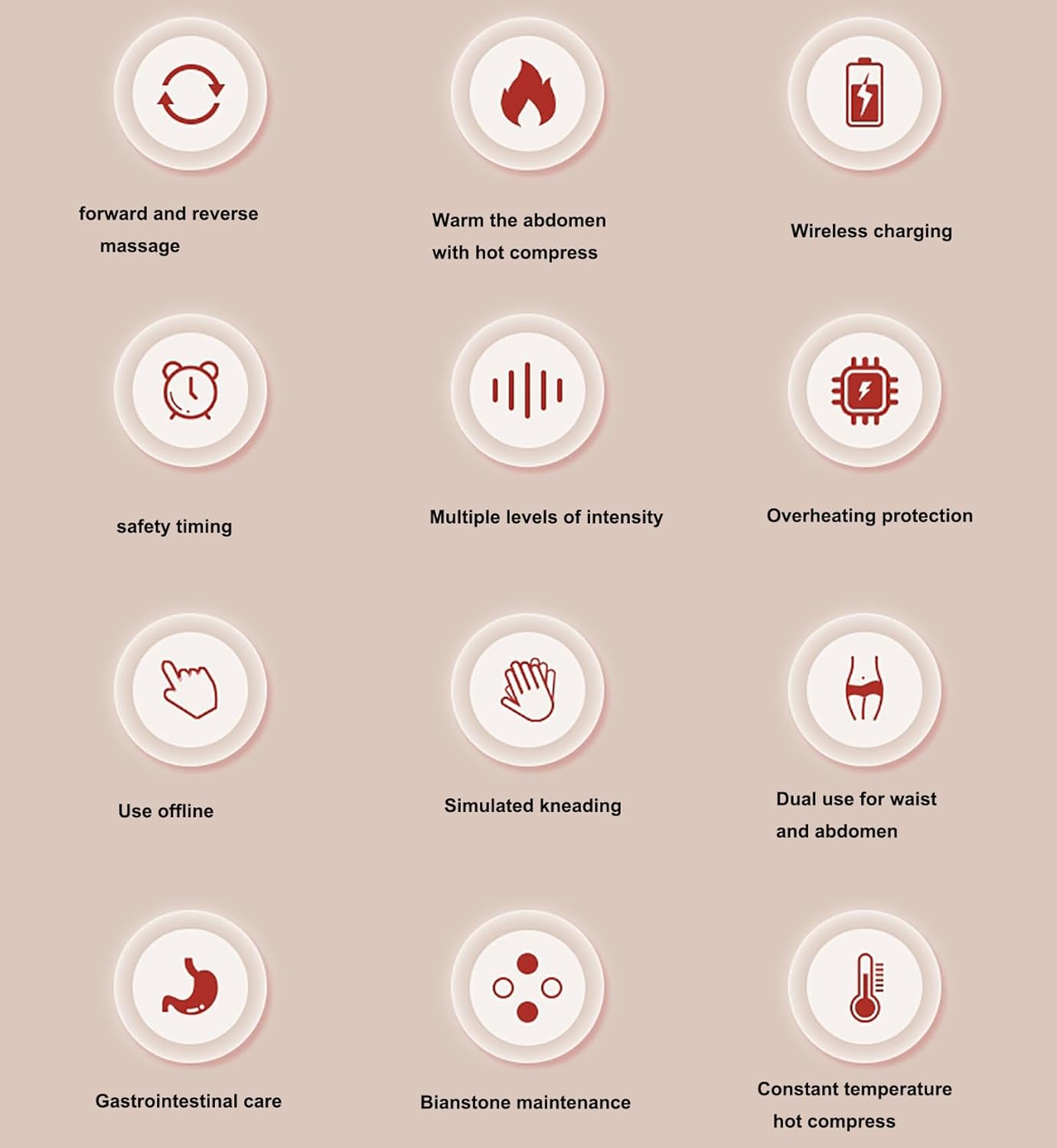 Built-in 3 constant-temperature Bianstones provide deep warmth and gentle kneading to help relax the abdomen and improve comfort.